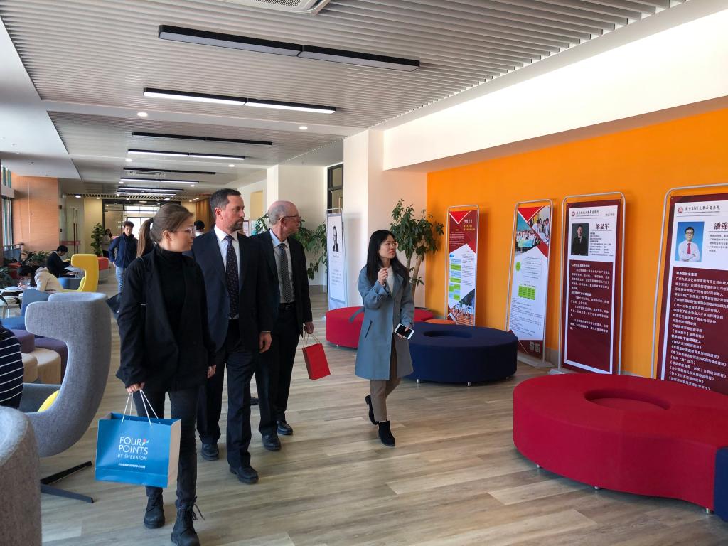 会谈结束后,美国汉弗莱斯大学来访代表团在我校代表的陪同下参观了华商学院图书馆、跨专业仿真综合实习平台、大传播实验教学平台。