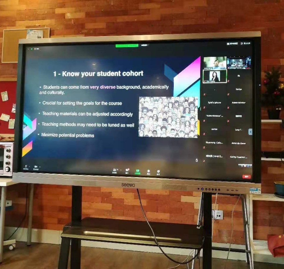 第二场讲座中,Andy Song教授围绕“如何处理教学中的困难情形”进行了有针对性的分析,他引用电影《机械师》的一句话:“明智的判断来源于经验,而经验则往往来自于错误的判断”以强调判断与经验相辅相成的关系。Andy Song教授就教材、课堂互动、作业考评、硬件故障、学生存在的问题及教学团队六个方面详尽解析了在教学中的潜在困难。他强调,要切实处理教学中的困难情形,就要确保教材的新颖性,保持教材与课程的衔接度;站在学生角度思考,增强学生课堂参与度;提前落实作业评判标准,注意作业难度的层级结构;课前做好设备检查,时刻准备应急方案;耐心、公平对待每一位学生,提高自身的亲和力;与教师团队保持及时、畅通的沟通。