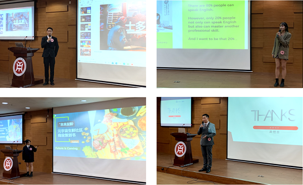 本次大赛的主题是:社区生鲜店的布局及营销方案。参赛选手依次展示了自己的策划方案,周倩同学通过关注弱势群体来展现肩负社会责任的方案。林嘉慧同学以自信、流利的英文展示了她富有魅力的方案。吴恺吉同学以品牌创始人的身份讲解了他别树一格的方案,王俊扬同学的方案切合实际并富有感染力。同学们精彩的演讲、创新的方案让评委与观众眼前一亮。嘉宾评委针对每位同学的方案提出问题,选手作答;评委对同学们的方案指出需要完善和改进之处。