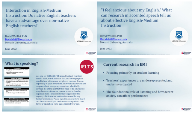 第二场、第三场培训讲座的主讲人是David Dai博士, 主题是:专业课教学中口音对英教学有效性的影响。David Dai博士通过介绍英语作为教学媒介EMI(English as a Media of Instruction)对教学效果影响的研究,并通过英语为母语的教师与非英语为母语的教师的教学作对比,分析教师们的发音对学生学习的影响。他认为英语作为授课语言时,学生更偏好熟悉的口音,这样可以降低他们的焦虑并专注于内容的学习,因此口音不会对学生学习造成太大影响,相反在一定程度上能够促进学习。他建议教师们在EMI课堂上创造良好的师生互动氛围从而有效提升学生的语言学习能力,EMI的教学应侧重于教学互动,尽可能避免因语言缺陷而带来的学习效率低下现象。