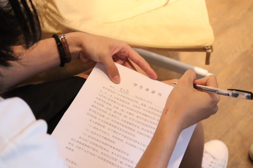 两校区领队老师安排同学们签署学生承诺书,并再次强调出行安全及研学相关注意事项。(图文/国际交流与合作处暨港澳台办)
