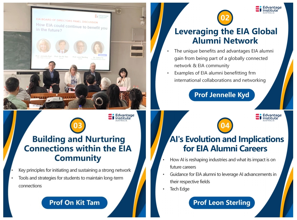 EIA校长Celina Yu博士向大家介绍了EIA的办学情况和EIA董事会成员,并说明了举办此次研讨会的目的。董事会主席Jennelle Kyd教授以“利用EIA全球校友网络”为主题,分享了EIA校友从国际合作和网络中受益的例子,介绍了EIA校友从成为全球互联网络和EIA社区的一部分中获得的独特益处和优势。