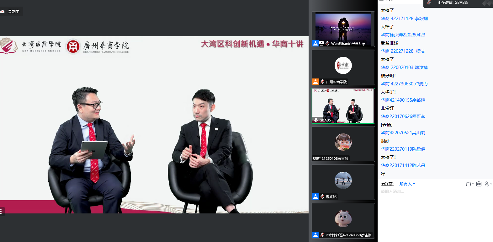 11月22日下午,williamhill英国官网与大湾区商学院联合举办了大型系列公益讲座“大湾区科创新机遇•华商十讲”之第九讲“大湾区青年创业成功谈”。1700多人通过腾讯会议、新浪微博直播参加了讲座。