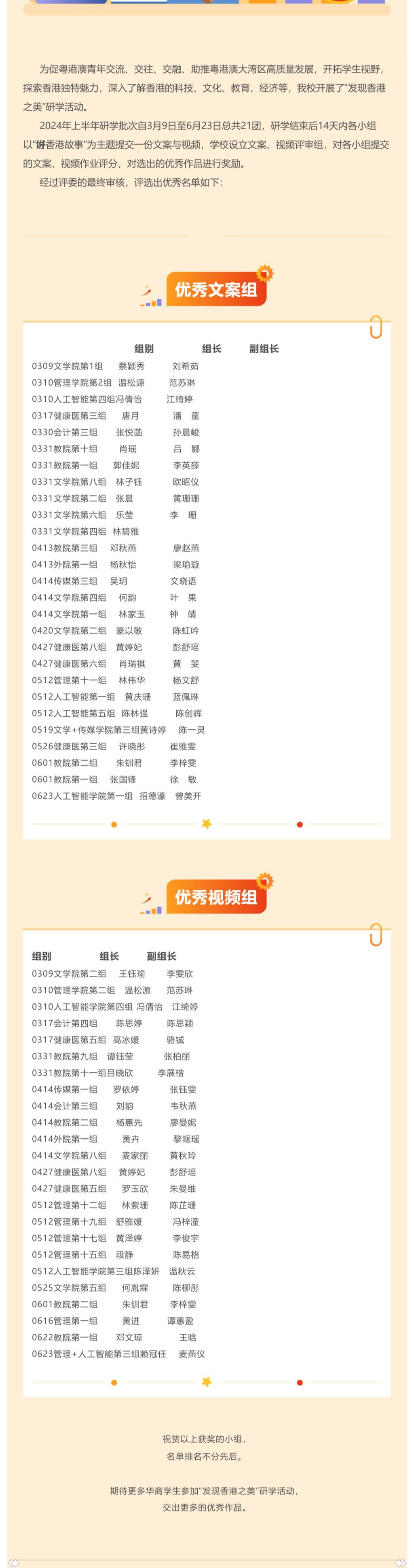 2024上半年“发现香港之美”研学活动优秀文案、视频创作小组名单